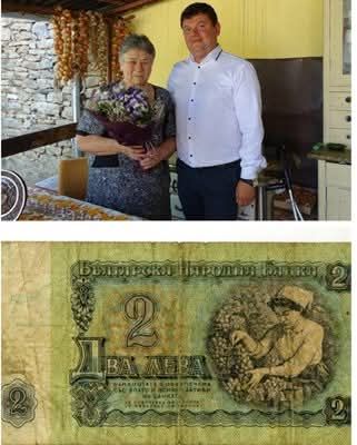 Кина Гърбова с кмета Пламен Чернев. Тя е 16-годишна, когато ликът й се появява върху социалистическата двулевка ( на снимката долу).